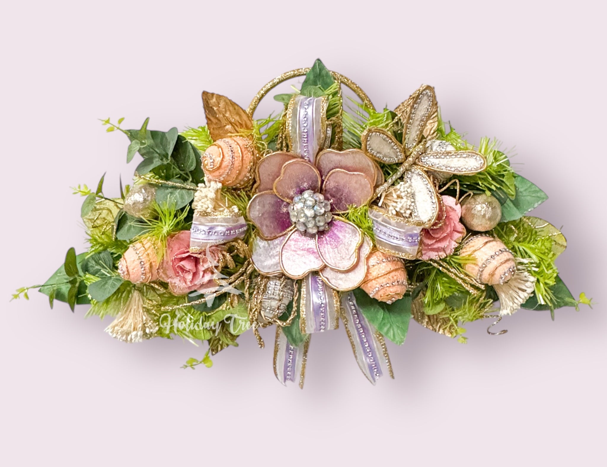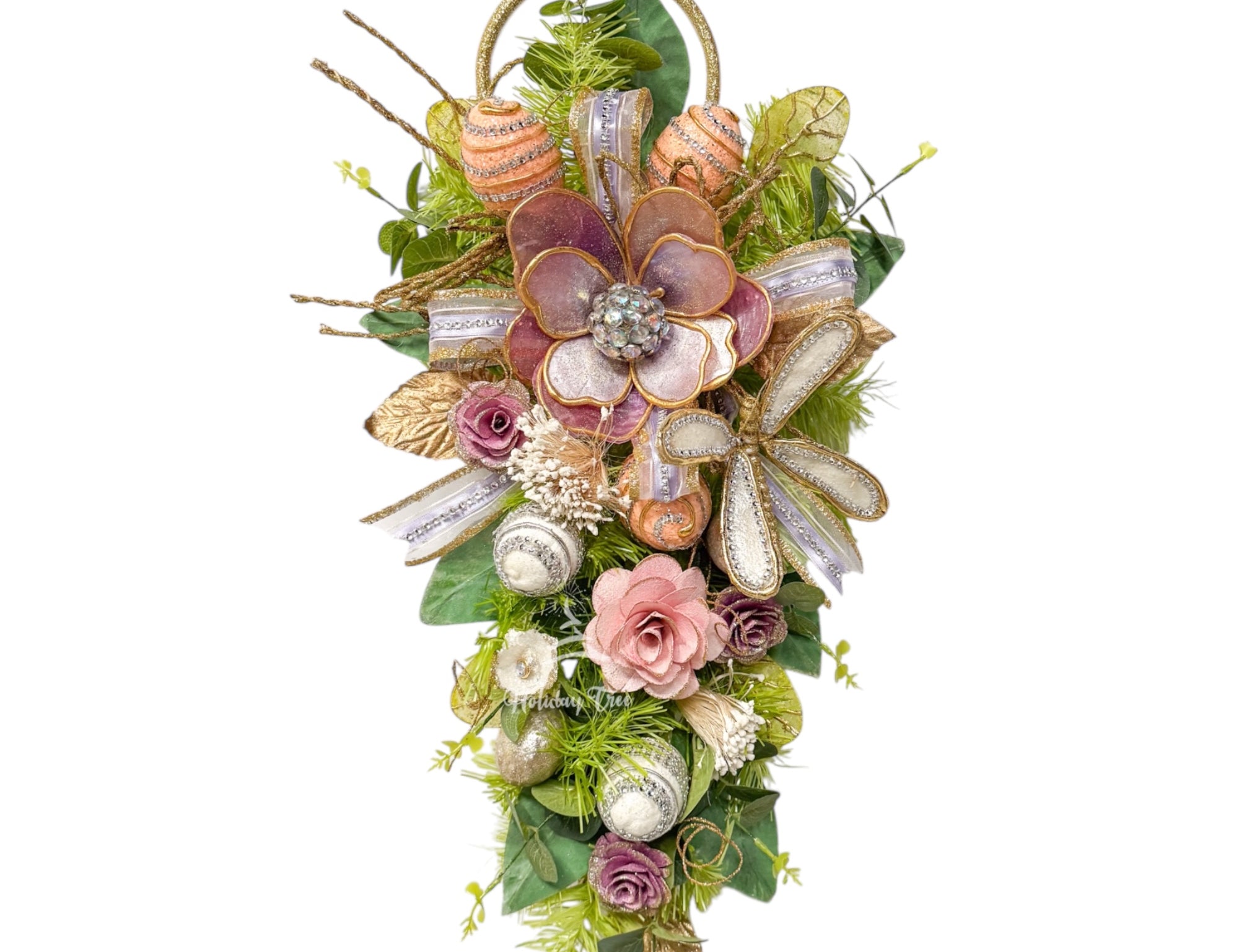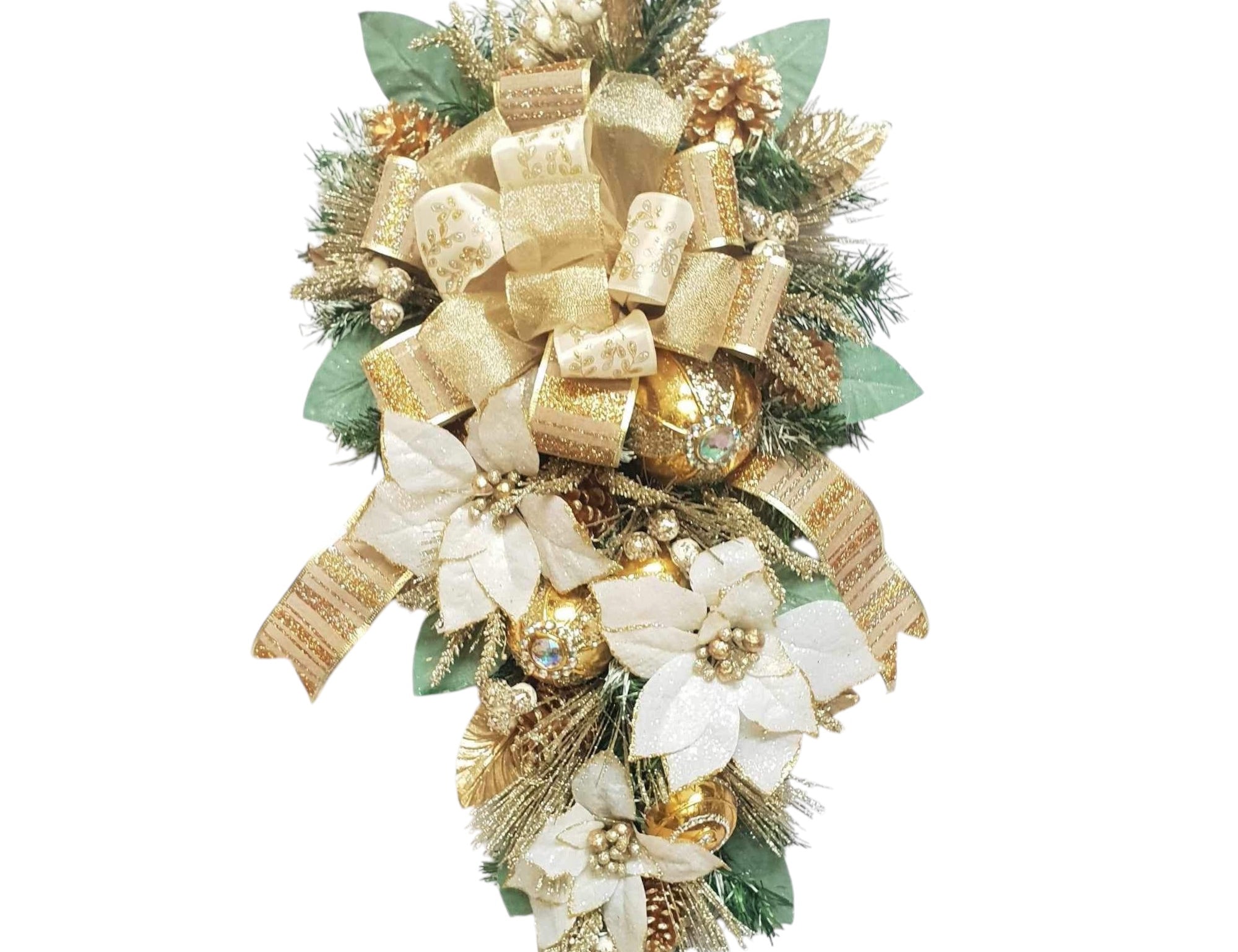 A teardrop swag is a decorative holiday piece, often made from evergreens, ribbons, and ornaments, designed in a teardrop shape. It's a popular choice for door, wall, or mantle decoration during the festive season.