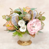 Bring the joy of Easter into your home with our enchanting Easter Floral Arrangement, a delightful handcrafted centerpiece. This stunning arrangement features vibrant faux peonies, delicate wood curl roses, capiz shell accents, jeweled dragonflies, lush greenery, and charming Easter eggs, all beautifully designed to capture the essence of springtime. Perfectly sized for tabletops, shelves, or mantels, this 11" arrangement effortlessly adds elegance and festive cheer to your décor.