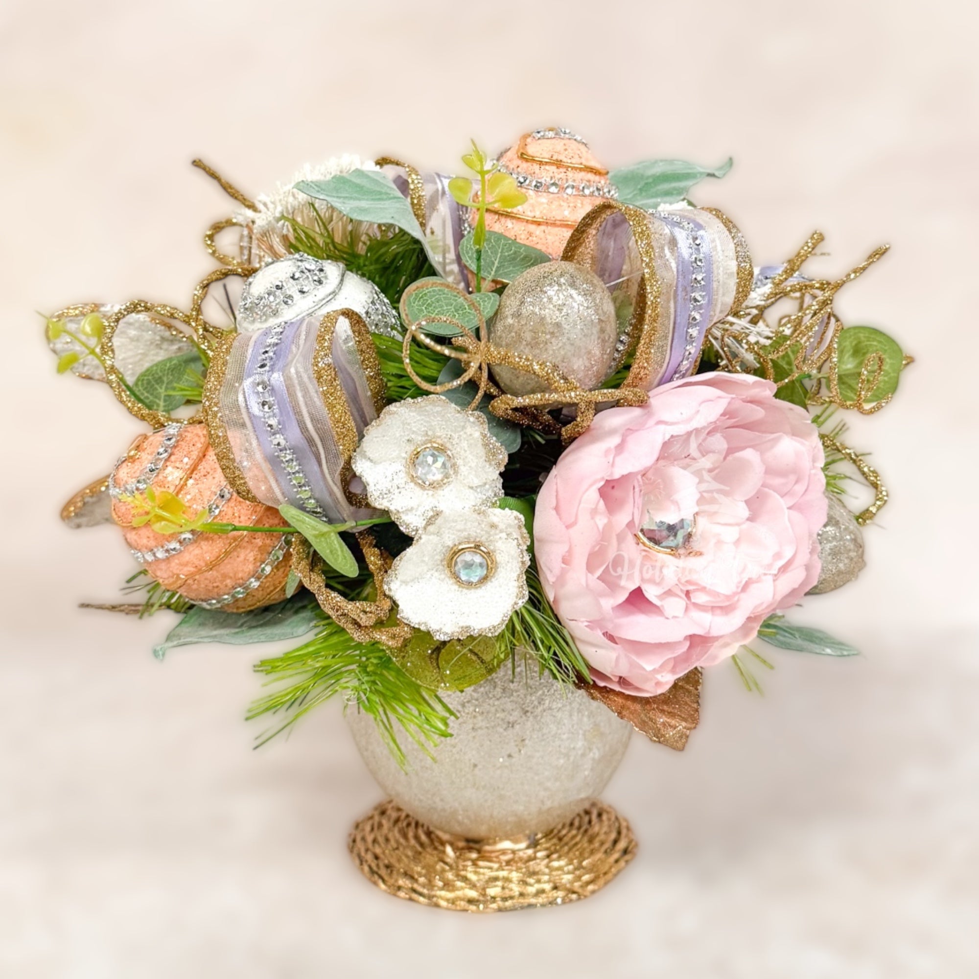 - Charming Easter Design: Adorned with capiz shell accents, faux peonies, wood curl roses, jeweled dragonflies, and Easter eggs for a vibrant and unique holiday display.