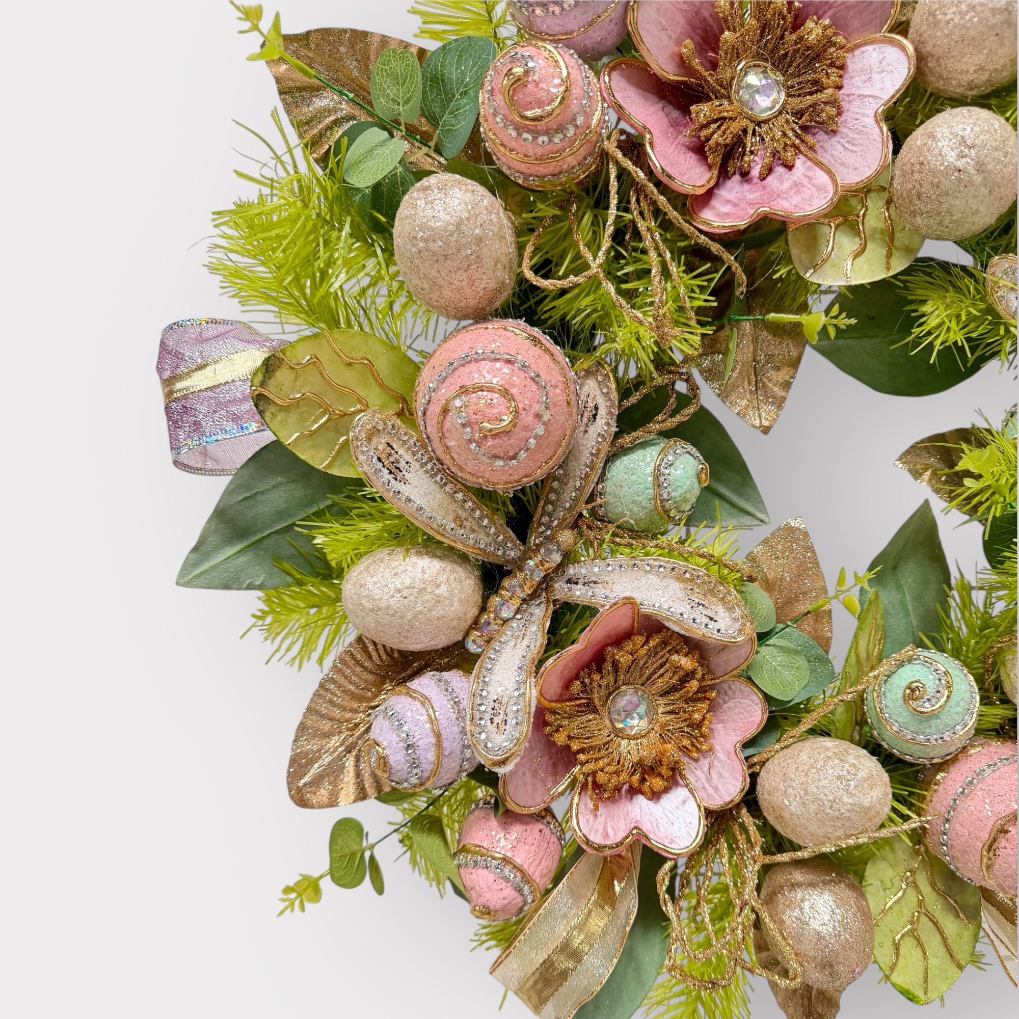 Immerse yourself in the elegance of capiz floral accents and jeweled dragonflies. These carefully chosen elements add a touch of sophistication and whimsy to your Easter decor.