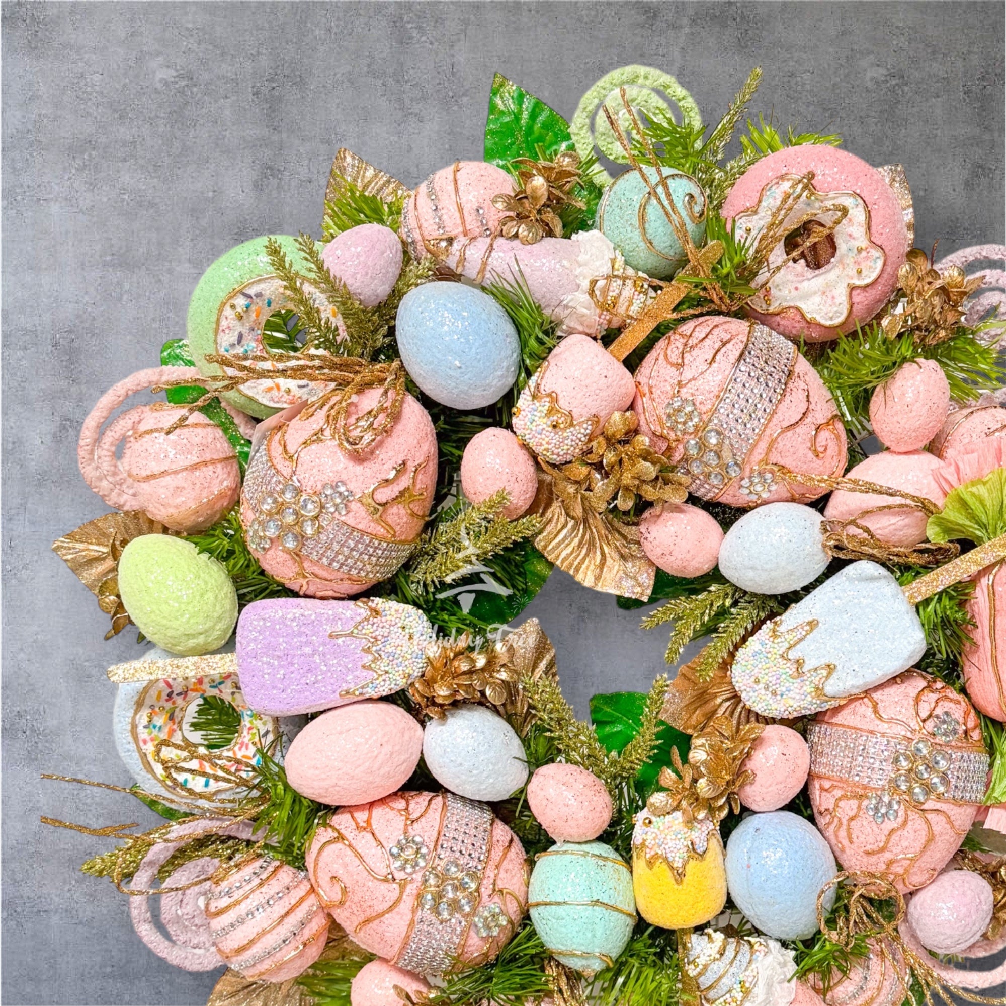 Add a playful twist to your Easter celebrations with the Easter Pastel Sweet Wreath, a whimsical masterpiece bursting with sweet delights. Adorned with sparkling jeweled eggs, pastel popsicles, donuts, and charming ice cream cones, this wreath is a sugary dream come true. Its vibrant colors and cheerful design will brighten any space, making it the ultimate Easter décor that’s sure to delight kids and adults alike. Hang it on your door, wall, or mantel and let the sweet magic of Easter shine!