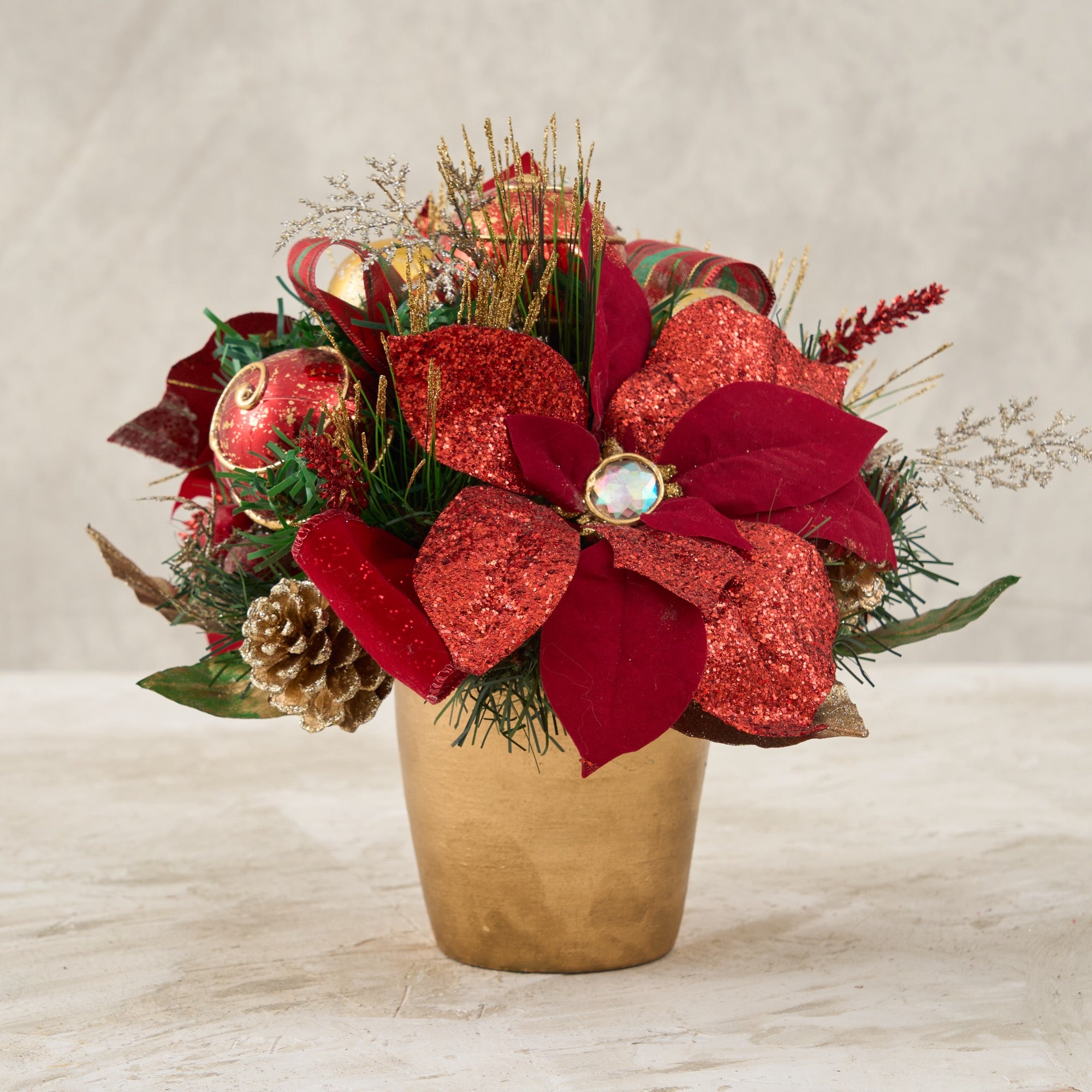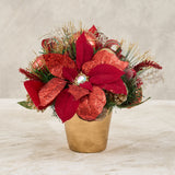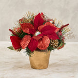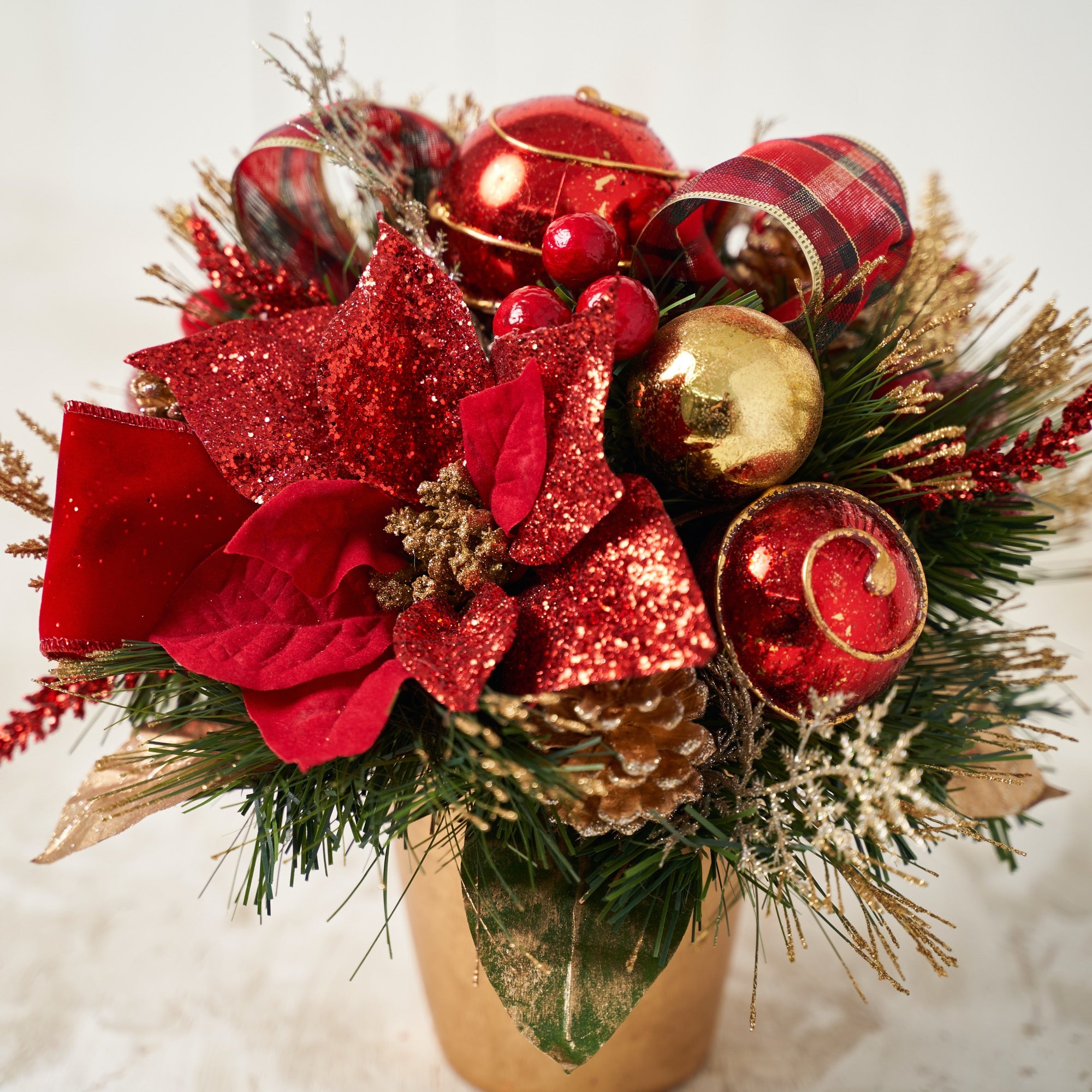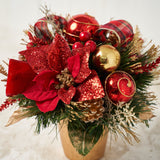 Handcrafted Red Poinsettia Centerpiece Pot - Get inspired with poinsettia arrangements ideas this festive season! Celebrate the love-filled holidays with our charming cone tree. It features glittery poinsettias, faux florals, lush foliage, berries, and ornaments, all adorned with a festive Red Plaid Ribbon. Display it on your table, in the living room, or throughout your home, effortlessly creating a Christmas-worthy atmosphere in your space.